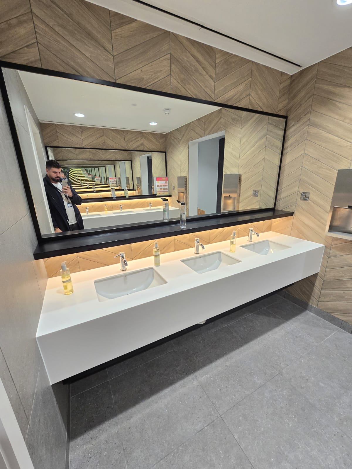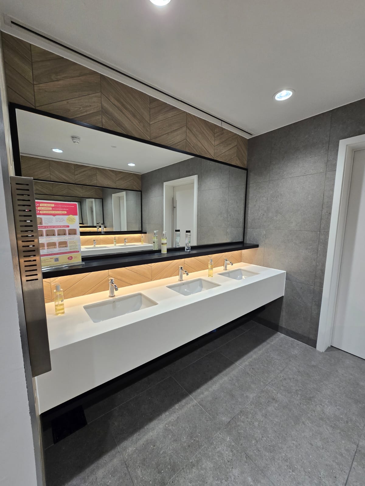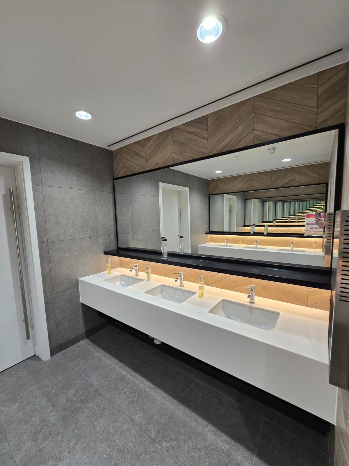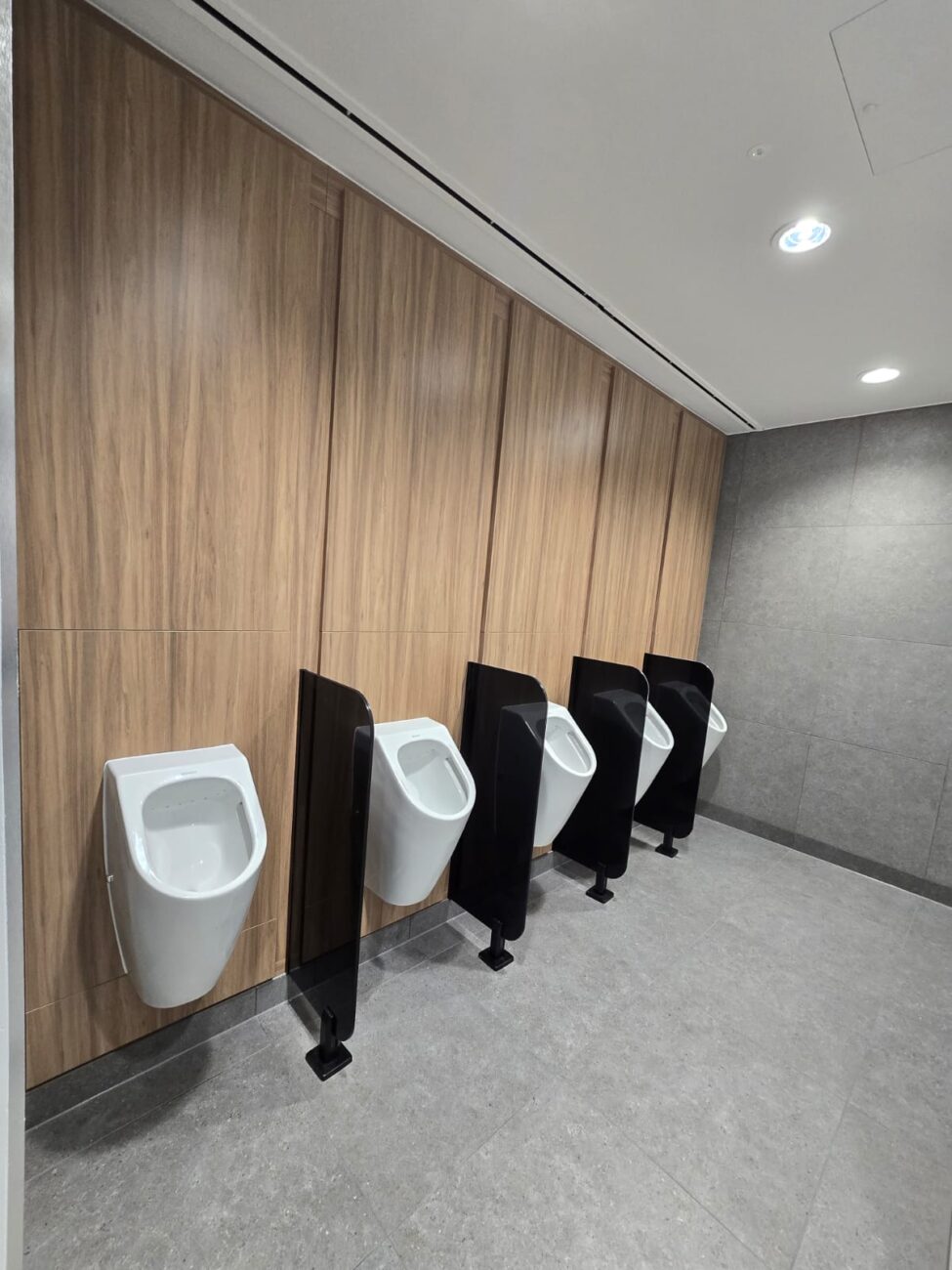 Our approach focused on creating a clean, contemporary aesthetic with robust, easy-to-maintain finishes. Solid surface vanity units provide a sleek focal point, while Polyrey laminate to the 20mm IPS panels and cubicles ensures long-term durability and hygiene. Bespoke back-painted glass urinal dividers introduce a high-end visual detail while maximising cleanability in a demanding washroom setting.