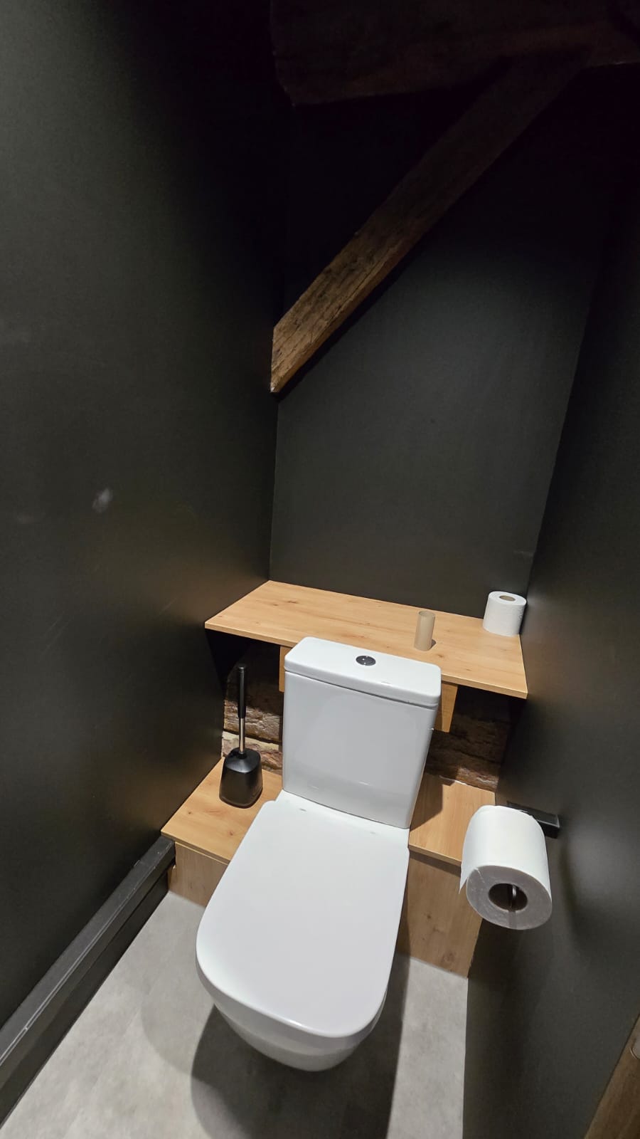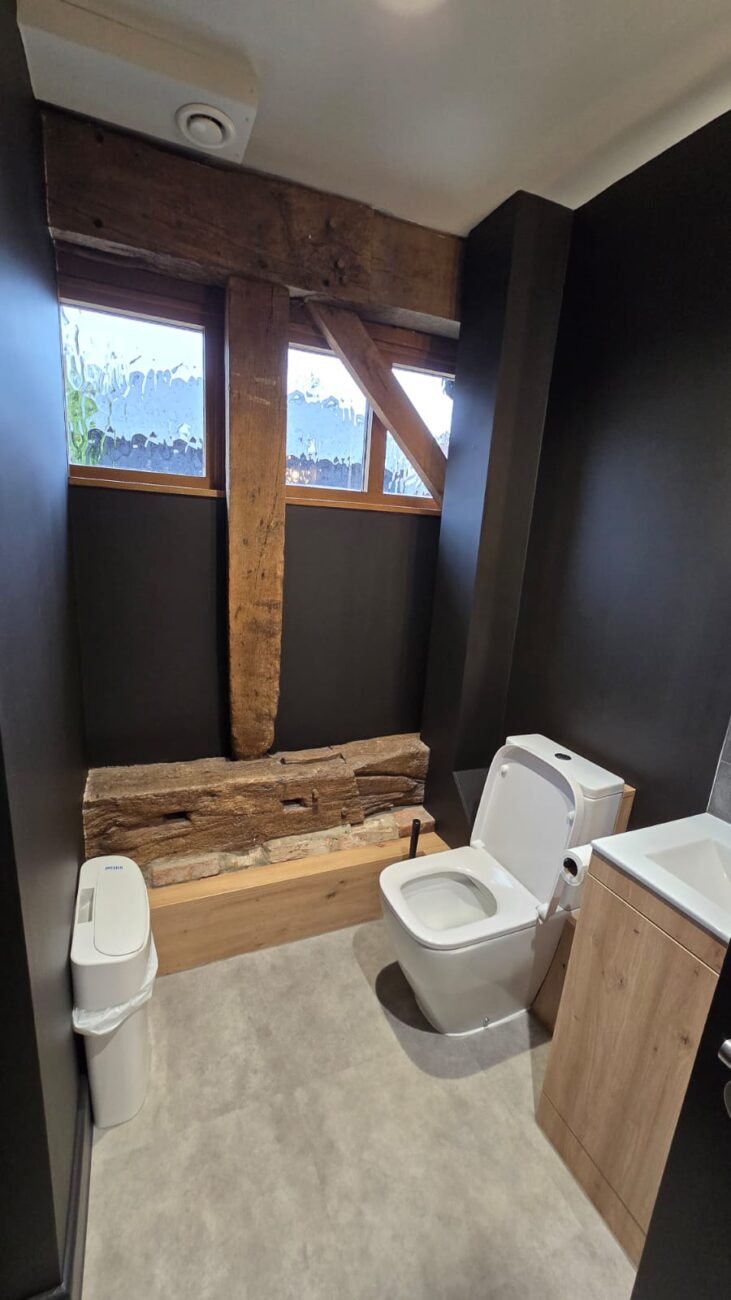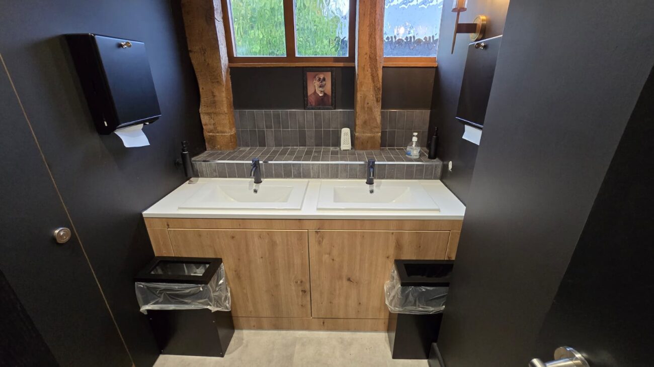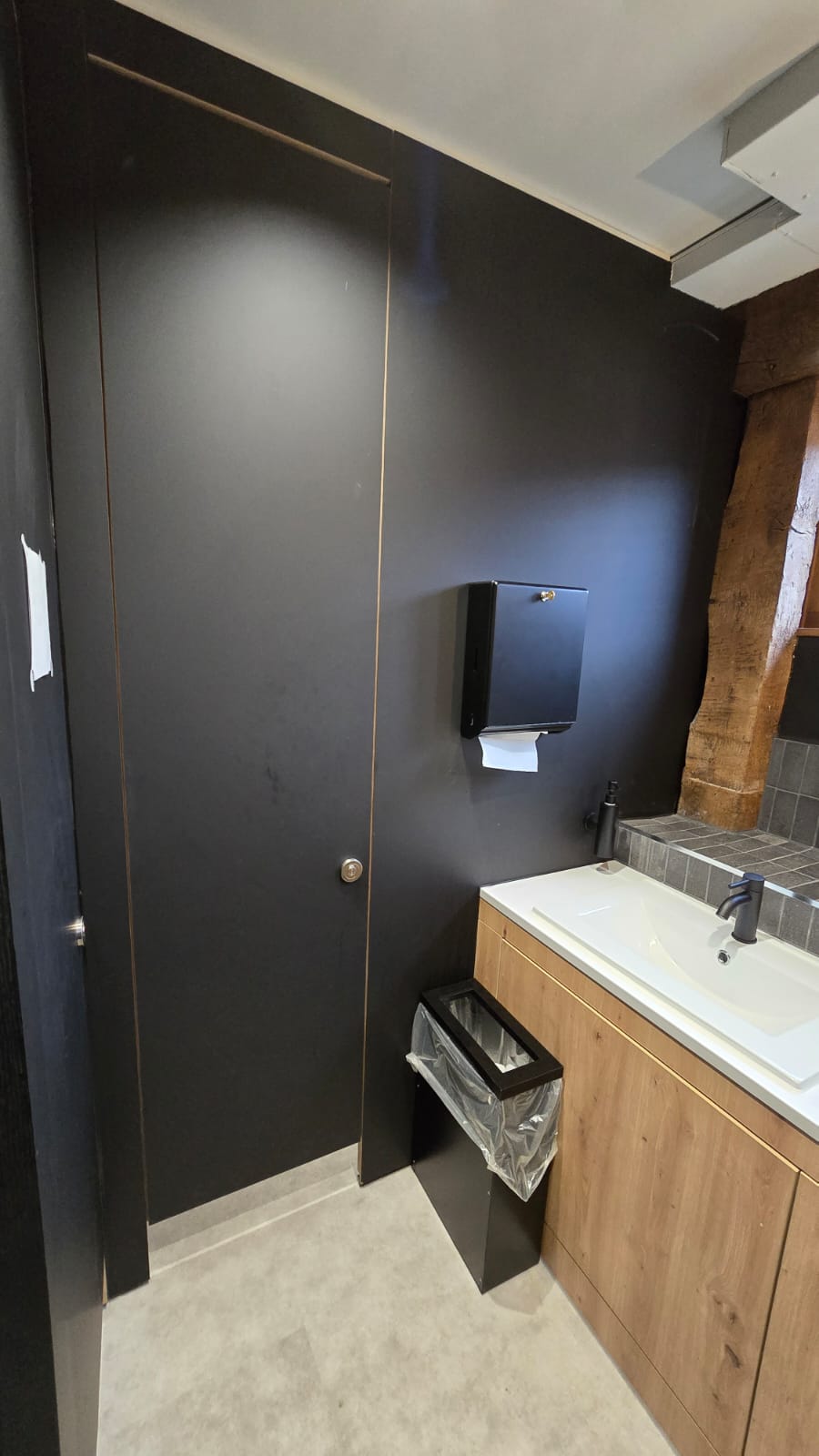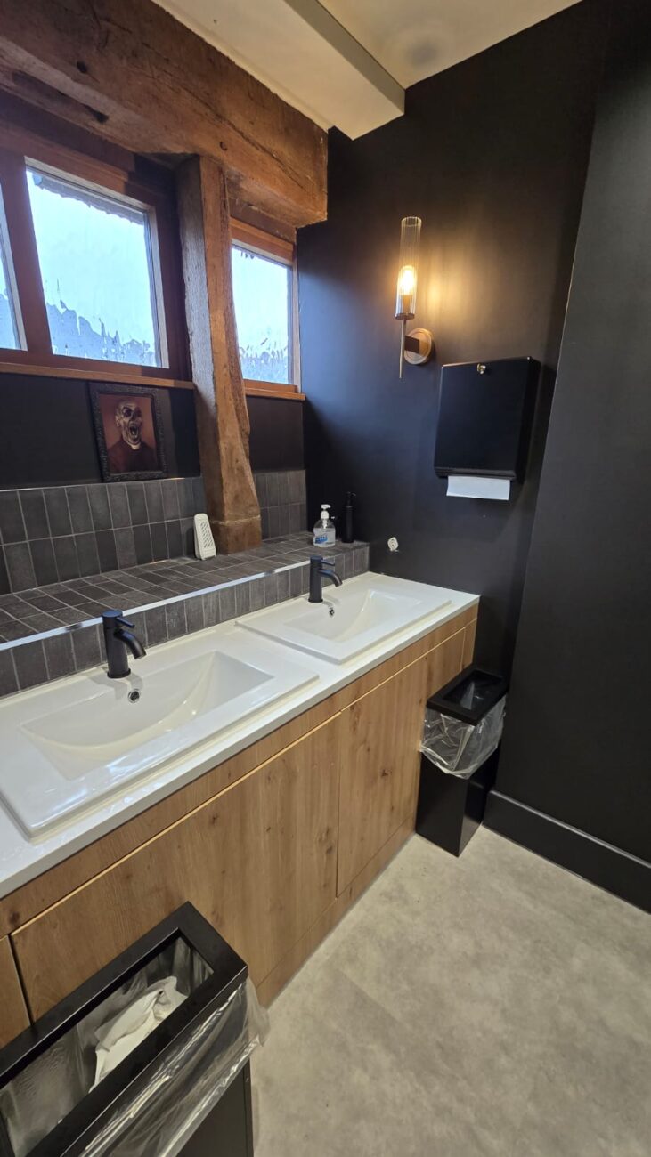 The completed washrooms achieve a sophisticated fusion of rustic character and modern design. By thoughtfully combining dark laminate, natural timber tones, and concrete-effect tiling, we have created a bold, immersive environment that reflects both the heritage of the building and the contemporary identity of Kinetic Games.